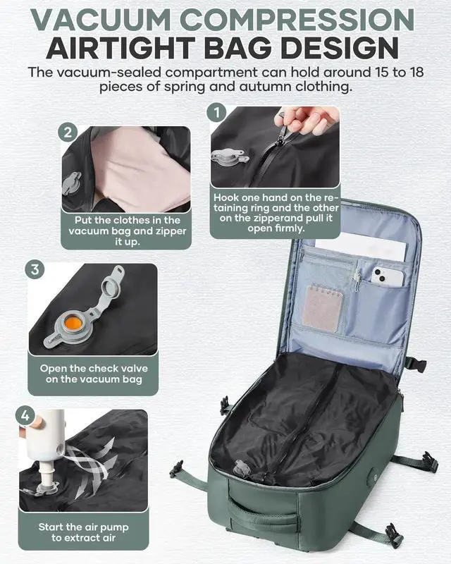 VENATIN Vacuum Backpack Travel with Pump for Women, Large Travel Backpack with Vacuum System, Personal Item Travel Bag 18x14 x 8 Inches, Water Resistant Business Work Laptop Backpack for Men, Army Green