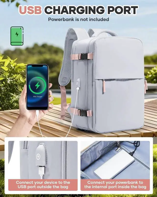USB Charging On-The-Go - USB charging port lets you power devices without opening the backpack - simply connect your power bank to the internal cable (power bank not included). The scratch-resistant port cover maintains weather resistance while providing instant access to charge phones/tablets during travel, hiking, or daily commutes.