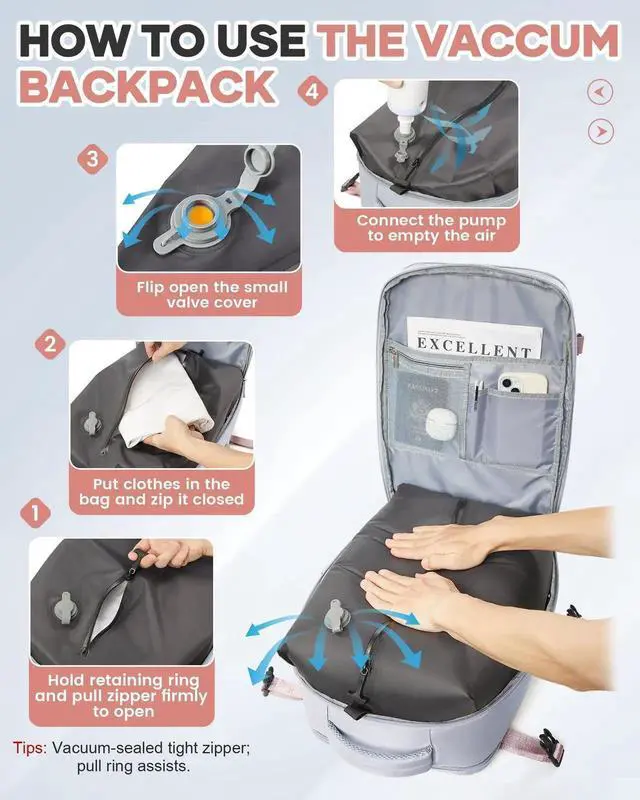 Vacuum Seal Travel Backpack with Air Pump,Compression Waterproof Vacpack Carry On Backpack for Travel Women Men with Vacuum System,Airlines Approved Daypack Laptop Space Saver Bags Grey