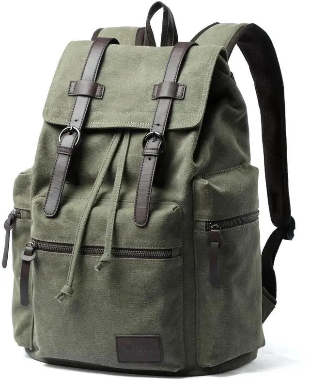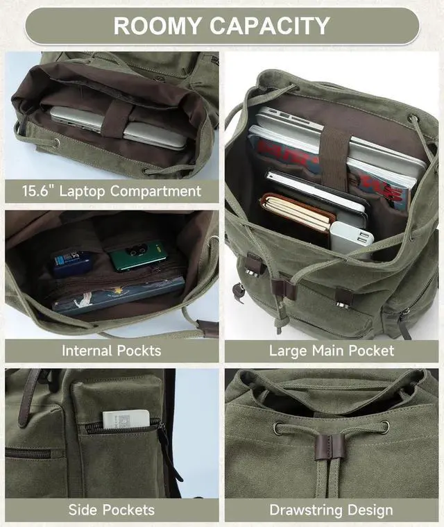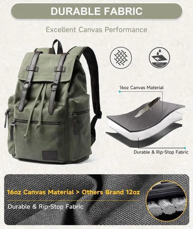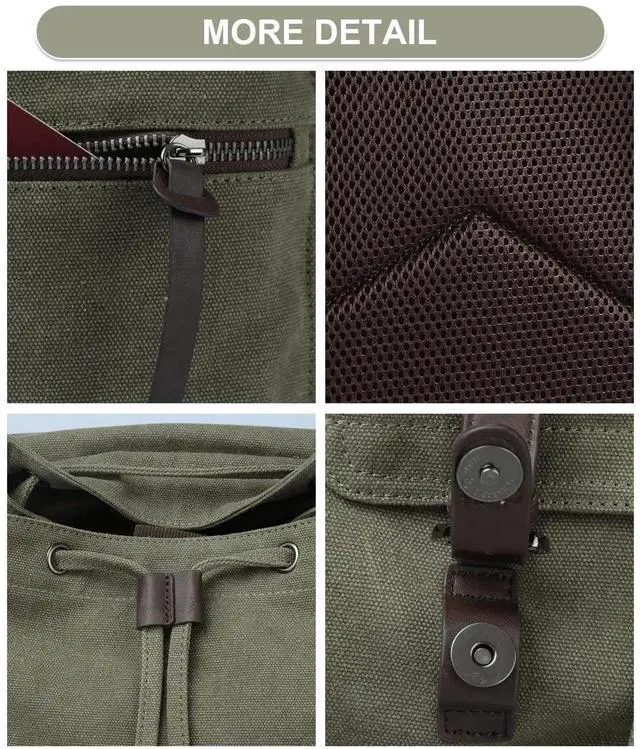 DURABLE&GOOD QUALITYThe MOYYI vintage canvas backpack is crafted from top-quality, high-density, long-lasting canvas fabric and leather. It showcases a flap and drawstring design, pairs with hardware accents, creating a laid-back retro style and ensuring security.
