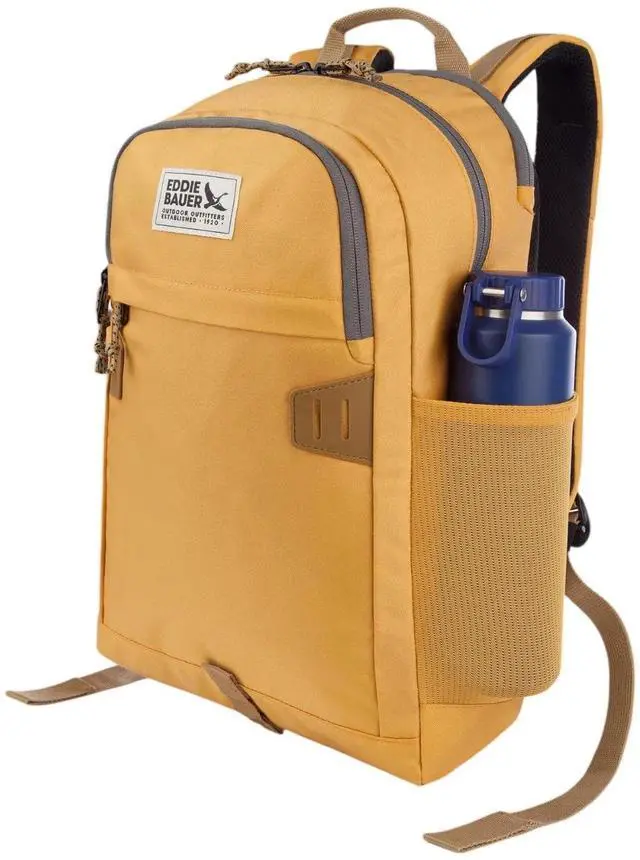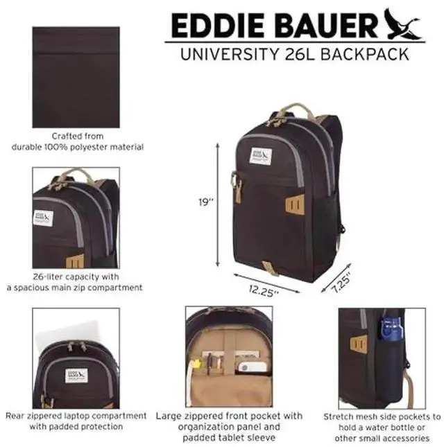 The Eddie Bauer University Backpack (26L) is designed for maximum organization, comfort, and versatility, making it the perfect companion for, work, travel, or everyday use. With a large main compartment, rear padded laptop compartment, and padded tablet sleeve, this backpack ensures secure storage for your tech and essentials. A front stash pocket provides quick-access storage, while the large front pocket with an organization panel keeps small accessories like keys, pens, and cables neatly arranged. Two stretch mesh bottle pockets offer easy hydration on the go.