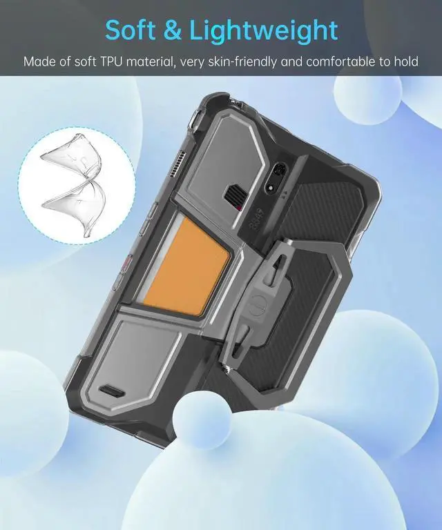 360°Rotating Stand + Soft Back Case 360°rotating tablet stand case provides different typing & viewing angles for studying, gaming, watching video; Meanwhile, the clear back cover not only provides protection, but also does not affect the color of your tablet itself, so you can use this tablet case holder indoors or outdoors with confidence