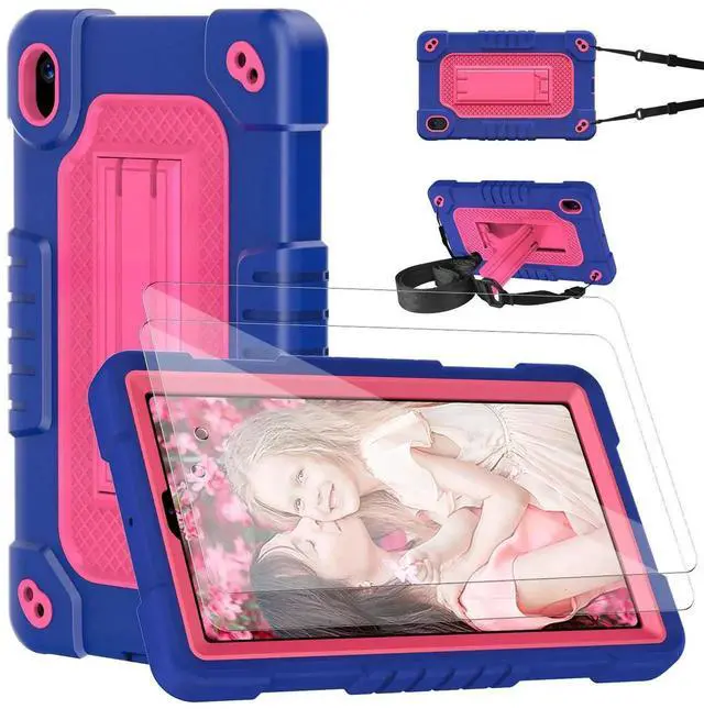 Hoibon Shockproof Case for Walmart Onn 7 inch Tablet Case (2024 Model 100135924) Rugged Kids Friendly Case with Screen Protector Shoulder Strap Kickstand for Onn 7 4th Gen 2024 Model (NavyPink+2Pcs)