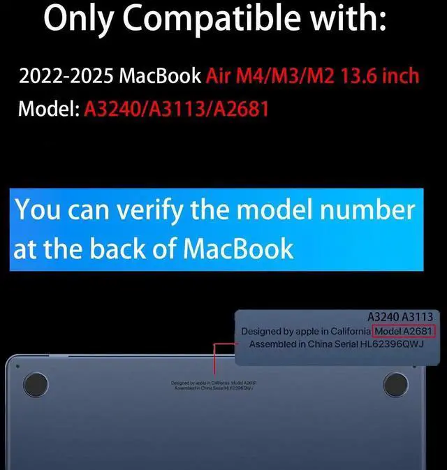 Check Your ModelONLY compatible with MacBook Air 13.6 inch 2022 2023 2024 2025 Release M4 M3 M2 Chip, (Model A3240/A3113/A2681). Please verify Model No. of MacBook before buying