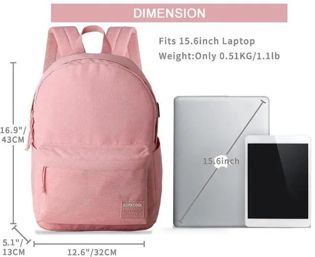 SUPACOOL Casual Laptop Backpack for Men and Women, Backpack for College, USB Charging Port, Lightweight Pack Back (Pink)