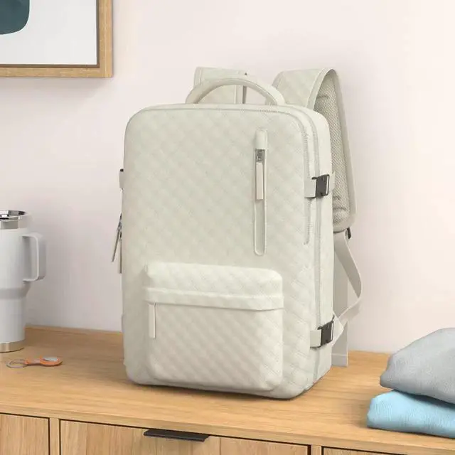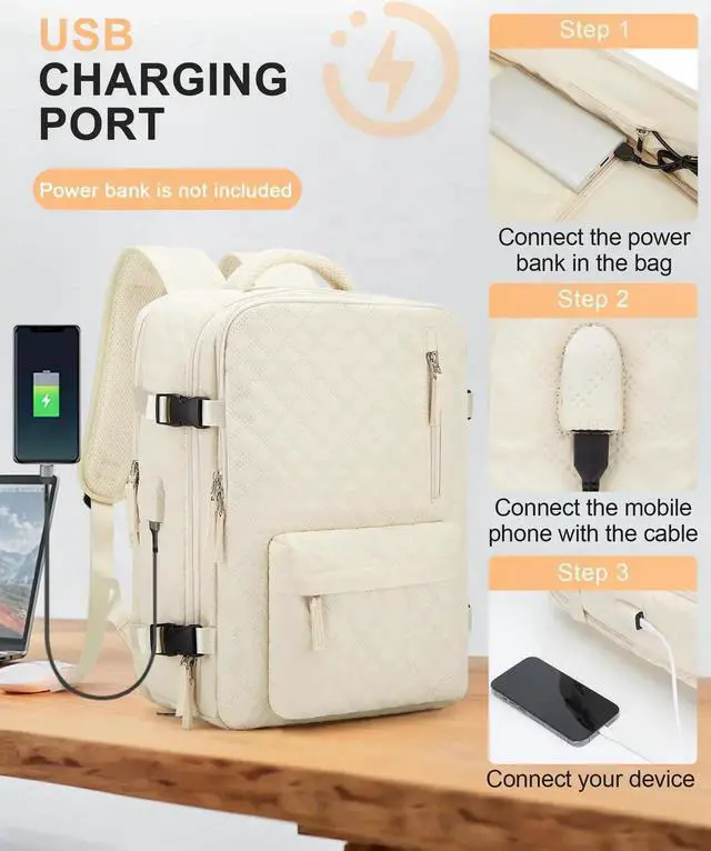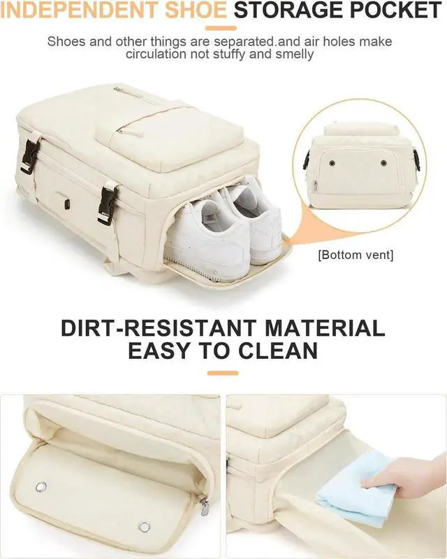 Travel Carry On Backpack for Women, Waterproof Laptop Backpack for Traveling on Airplane Hiking Gym Backpack with USB Charging Port Shoe Compartment, Beige
