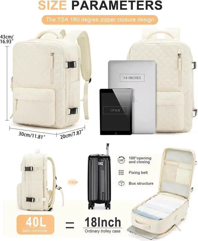 [Large Capacity Backpack] - With dimensions of 16.93*11.81*7.87in, this travel backpack can easily accommodate 3-5 days' worth of clothing, documents, a 14 inch laptop, and A4-sized files in the main compartment. The laptop storage pocket provides ample space not only for tablets and laptops but also for essential documents during short business trips. This carry-on backpack combines functionality and ample storage capacity, making it an ideal companion for travel and business scenarios.
