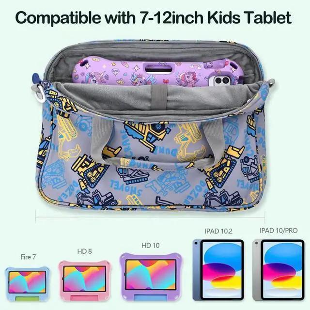 Topevoeon Kids Tablet Bag with Handle Shoulder Strap, 13 inch Cute Excavator Tablet Sleeve Carrying Bag Case for Boy Girl Fit Fire HD 10 HD 8 IPAD 10 11 A16 10.2 7 8 9 Kids pro Tablets WJJ