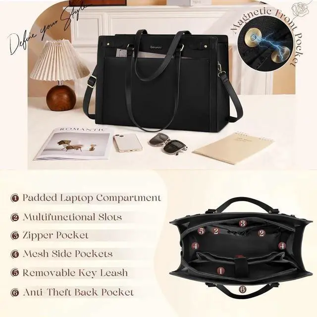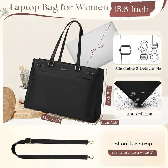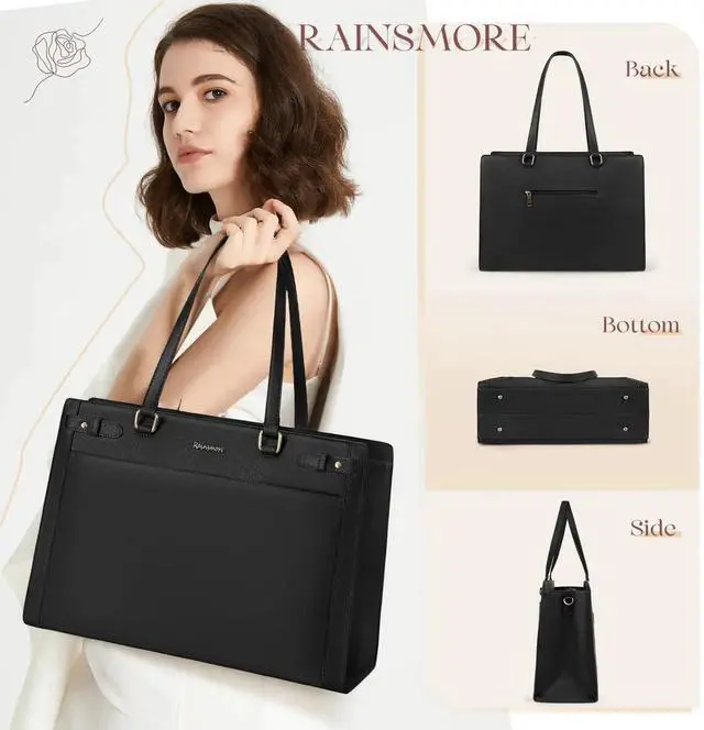 RAINSMORE Laptop Bag for Women 15.6 Inch PU Vegan Leather Work Tote Bag Waterproof Womens Briefcase Designer Computer Bags for Office Teacher College Travel Large Tote Purse Professional Black