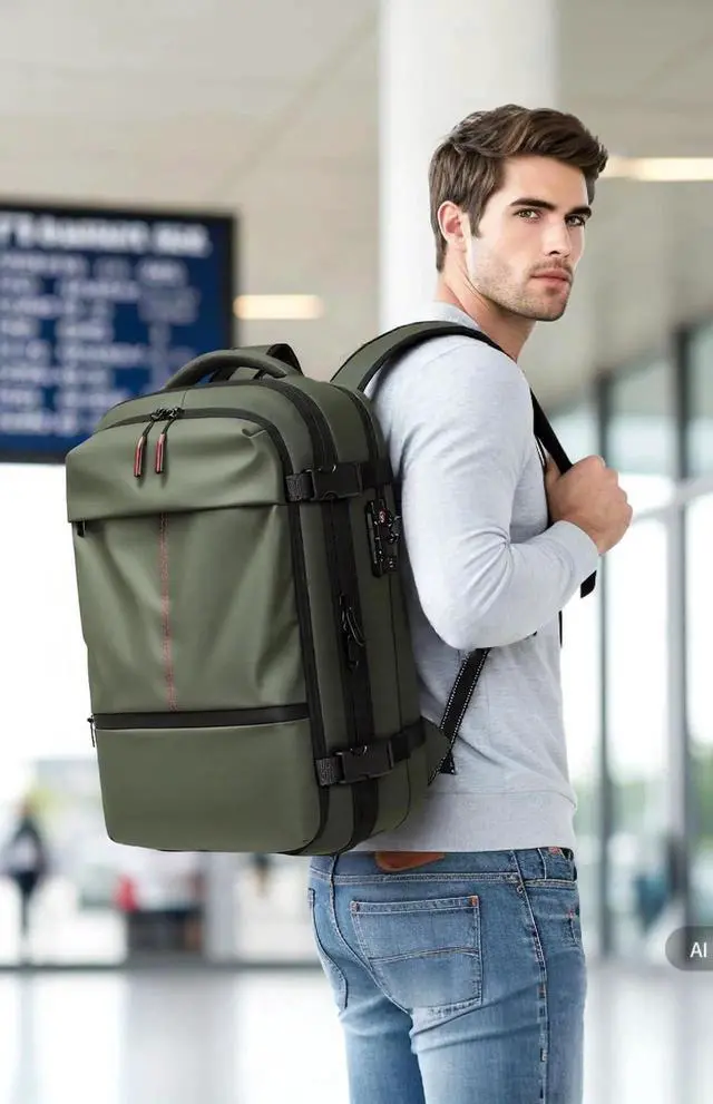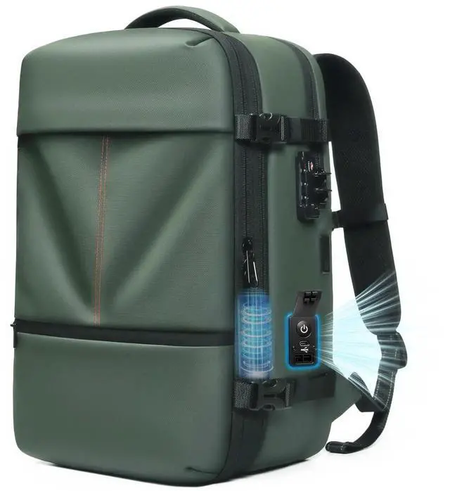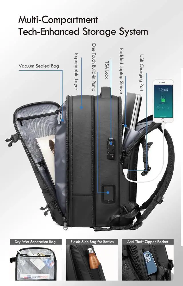 [Innovative Built-in USB Vacuum Compression System] This advanced technology replaces the need for a separate air pump, making your travel simpler. With just 1-Click, you can achieve airtight compression in under 3 minutes, reducing clothing storage space by up to 50% and maximizing your backpack's capacity. The built-in USB air pump is powered directly via a USB connection to a power bank or outlet, ensuring quick and effortless compression. No more extra devices, no more losing accessories
