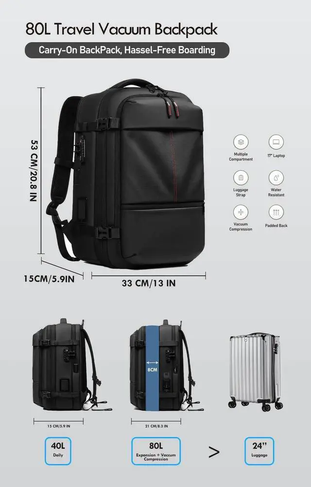 [Upgraded Capacity to a 26" Suitcase] Our improved vacuum travel backpack features +75% larger main compartment, and +50% larger AIR-TIGHT compression bag, offering much more room for your belongings. Combined with an expanded design, the backpack's capacity can be from 40L to an impressive 80L, making it perfect for extended trips, whether you're packing for 2 week-long business journey, a weekend escape, or hiking/trekking adventures. You'll never run out of space again!