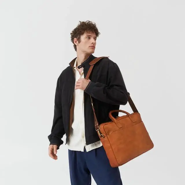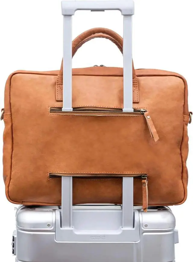 DESIGNED IN BERLIN, GERMANY. The Madrid leather laptop bag is thoughtfully designed in Europe and crafted from high-quality, durable materials for long-lasting use. This cotton-lined satchel features a spacious main compartment, a 15 laptop compartment, a phone pocket, pen holders, and zippered pocket. Durable metal hardware and YKK zippers ensure long-lasting use.