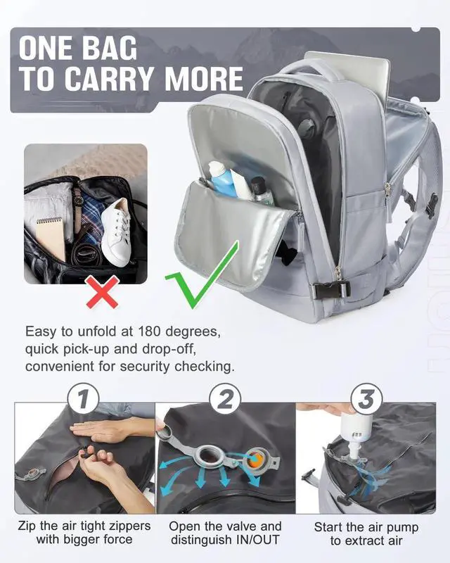 VENATIN Vacuum Backpack Travel,Travel Backpack with Vacuum System,Vacuum Seal Compression Backpack with Pump for Travel,Flight Approved 18x14x8 inches Laptop Bag,Grey