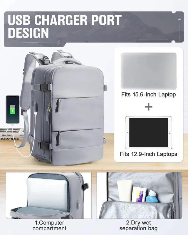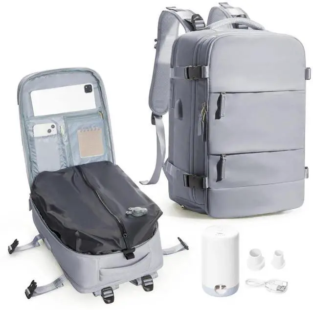 VENATIN Vacuum Backpack Travel, Travel Backpack with Vacuum System, Vacuum Seal Compression Backpack with Pump for Travel, Flight Approved 18x14x8 inches Laptop Bag, Grey