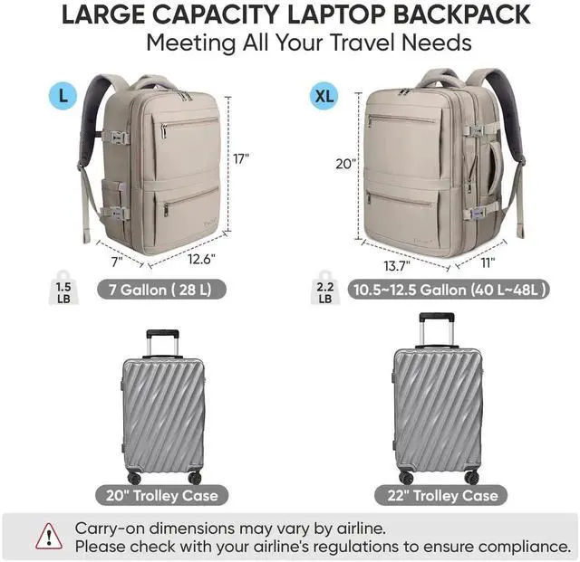 Large Capacity: The travel laptop backpack comes in two sizes: L (17"x12.6"x7"), weighing 1.5 lb, with a 28 L capacity, and XL (20"x13.7"x9"), 2.2 lb, 40 L capacity, expandable to 48 L; This backpack for travel offers a large capacity with dedicated spaces for your laptop, books, wallet, clothing, shoes, and other essentials; The multi-pocket design ensures that your items are organized and easily accessible