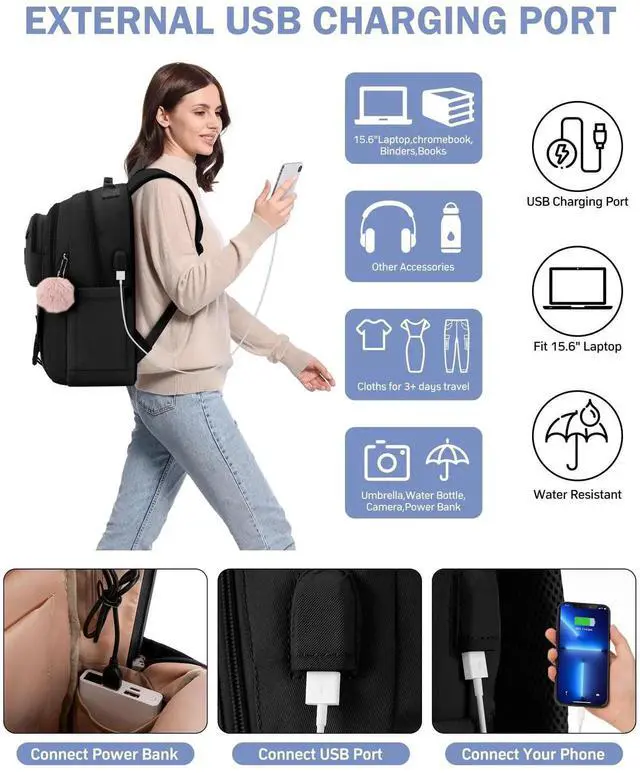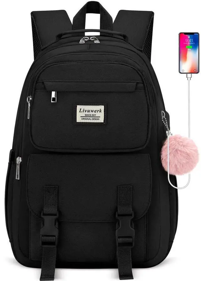 School Teen Girls Bookbag: 15.6 Inch College Students Backpacks with Charger Middle High School BookBags Durable Travel Laptop BackPack for Women Casual Daypack Black