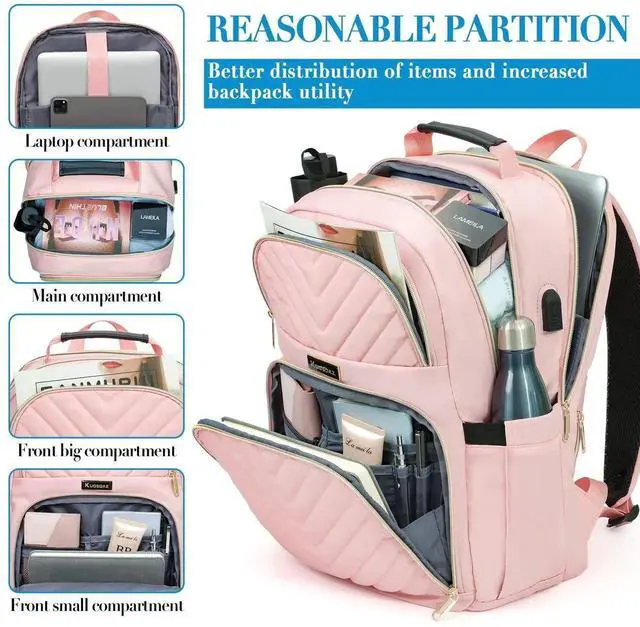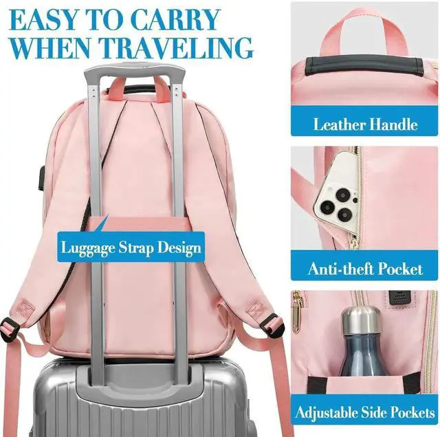 Fashion Pink & Gold Water-resistant Material: Pink backpack for women is made of fashion stitch texture polyester waterproof fabric and gold-plated zipper on the outside, and tear-resistant material on the inside for durability. The top of the Laptop backpack is equipped with a comfortable PU leather handle, which is easy to carry and adds a fashion feel.