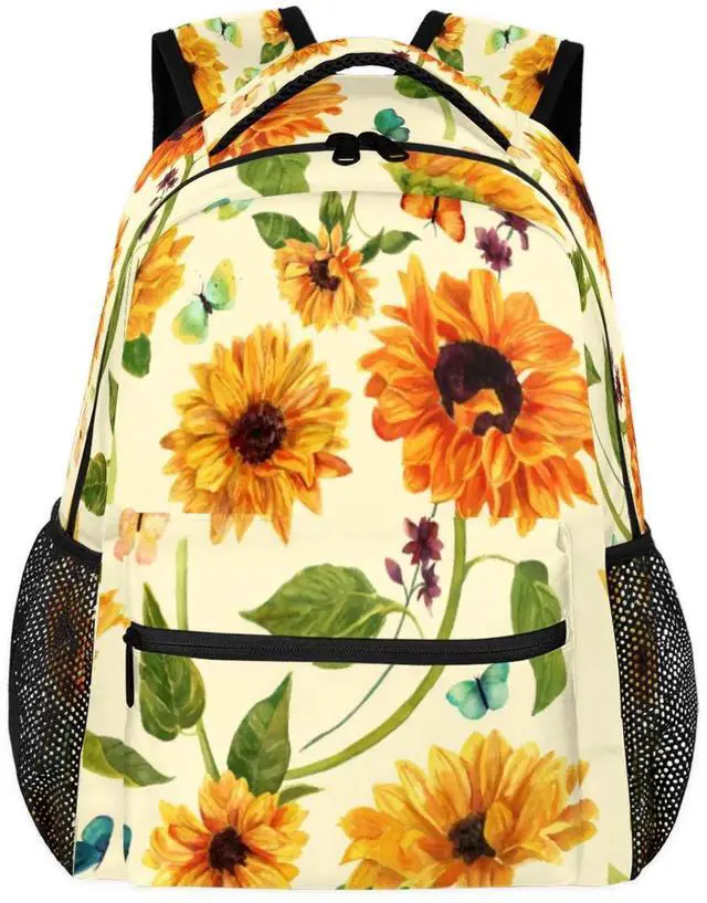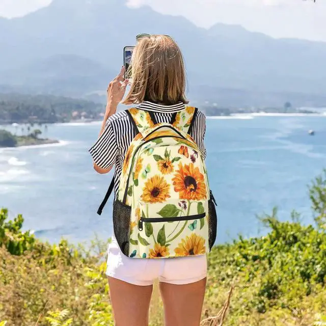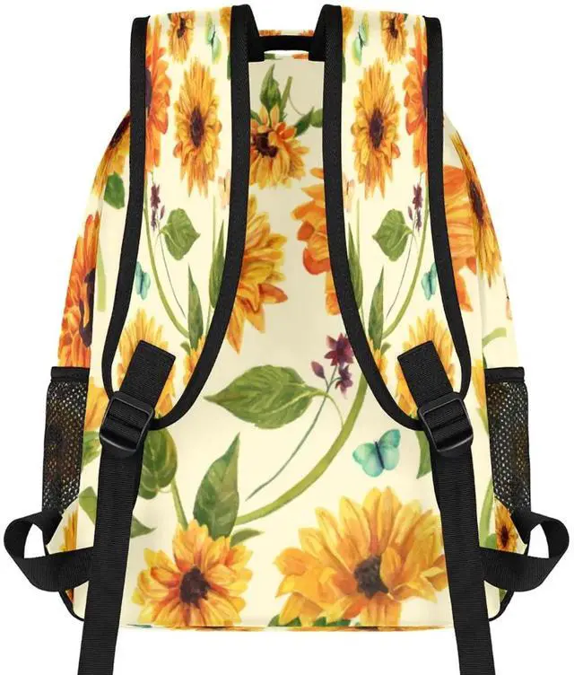 Backpack Size:11.4"(L)x6.9"(W)x16"(H) / 29 cm(L)x17.5cm(W)x40.5cm(H).This yellow flower sunflower backpack have large capacity, sure to have room for every little things you need organized.