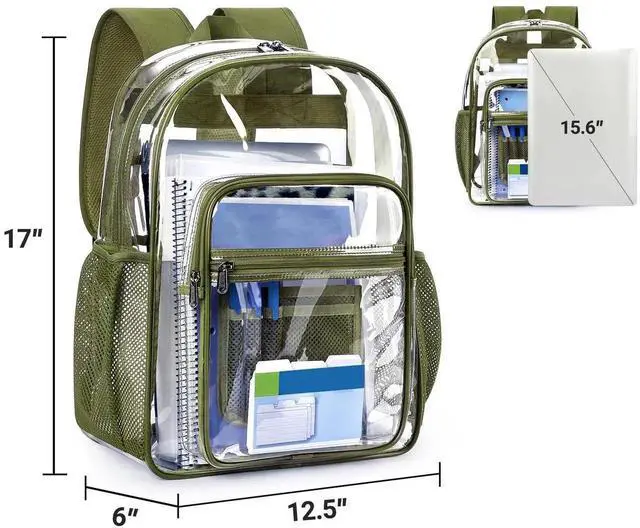 ZORFIN Clear Backpack Heavy Duty for School & Work 17in Transparent PVC Bag with Large Capacity & Reinforced Straps See Through Bookbag for Men, Women, Boys & Girls, Workplace Security - Green