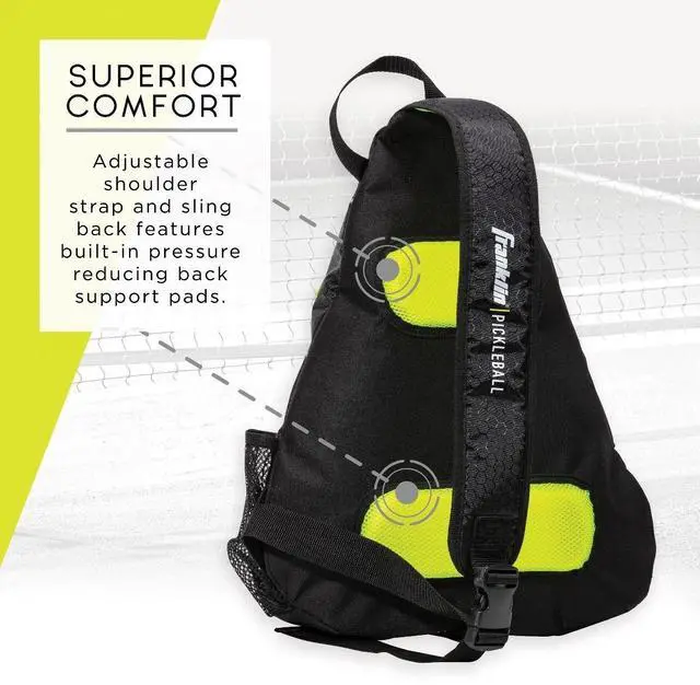 The Franklin Pickleball Sling Bag is the official bag of the US Open and has been designed to carry all your pickleball gear and more comfortably and conveniently. The Sling Bag can hold 6 paddles securely and 6 X-Performance 40 official pickleballs with room to spare. This bag will help keep your personal devices safe in the designated felt lined soft pocket. Heading to the court on a hot day? The Franklin Pickleball Sling Bag can carry your favorite sports bottle too. When you get to the game, clip the bag onto the court fence with our easy to use fence hook!