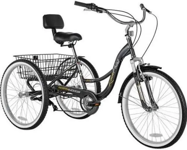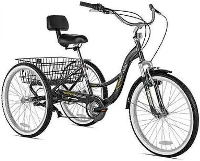 Travel with flair using the Northwoods 24'' Adult Tricycle - Rock Point for errands, staying fit, or just for the fun of it! It features high tensile steel construction for excellent strength and is armed with authentic Shimano 7 speed Revo Twist Shifters for effortless pedaling and shifting. Moreover, it's designed with back support seating as well as an easy-access position--all for your convenience. Additionally, a large rear basket (metal mesh) is included for carrying packages. It makes trips to the grocery a piece of cake. Finally, its brake system boasts front and back braking of wheels (24-inch diameter) for ensured and safe stopping. Avail the Northwoods 24'' Adult Tricycle - Rock Point today!Tricycle Dimensions: 68'' x 31'' x 30'' (Assembled); 24'' Diameter (Wheels) / Weight: 57 Lbs3 Wheel Bike Features High Tensile Steel Construction For Excellent Strength And Is Armed With Authentic Shimano 7 Speed Revo Twist Shifters For Effortless Pedaling And ShiftingIncludes Large Rear Basket (Metal Mesh) For Carrying Packages, Along With Back Support And Easy Access Seating For Your ConvenienceBrake System Boasts Front & Back Braking Of Wheels For Ensured And Safe StoppingEnjoy Manufacturer's Limited Warranty Of 6 Months As Well!