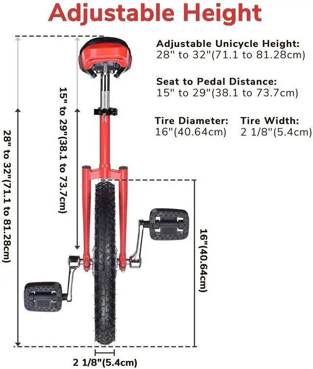 - Adjustable Unicycle Height: 28" to 32" (71.1 to 81.28 cm)