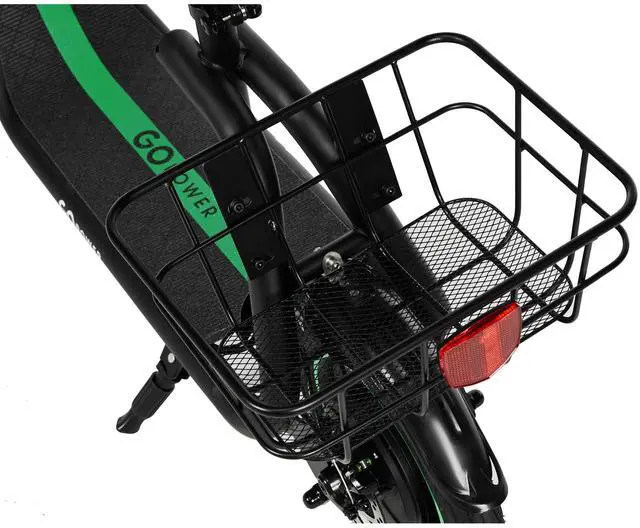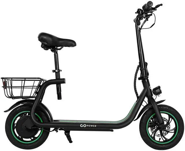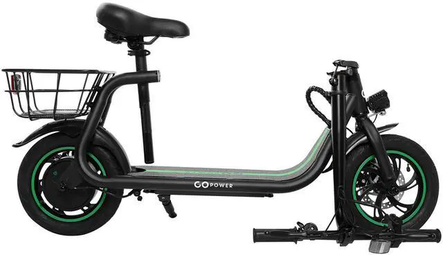 This scooter also includes a front headlight for visibility, a rear basket for convenient storage, and a front display that shows battery status. Designed with a strong frame and a comfortable seat, the Go Flow is equipped to handle riders up to 265 lbs. Experience the freedom of easy transportation with the Go Flow Electric Scooter.