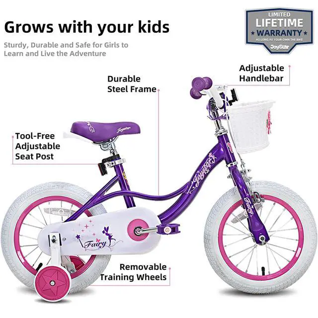 Kids can learn how to go from 4 wheels to 2 with the Joystar Fairy 12-Inch Kids Bike. This whimsical bike with removable training wheels gives little ones confidence and style, all they need to conquer the neighborhood sidewalks!