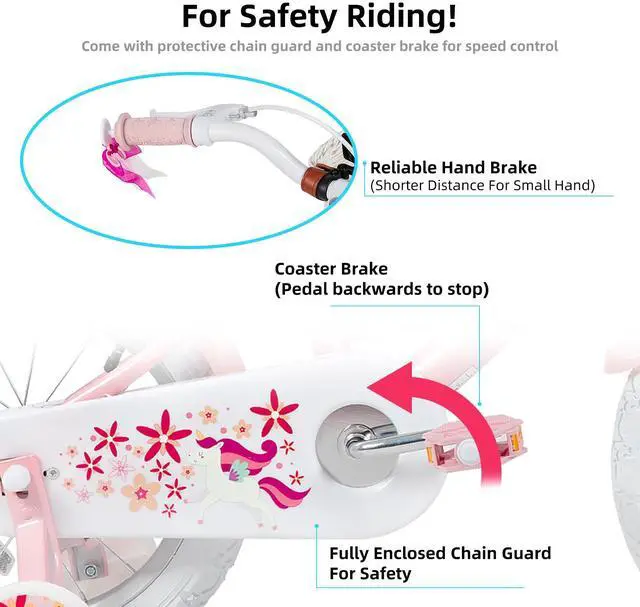 • Safe Braking System: The JOYSTAR Unicorn Kids Bike features front caliper brakes and rear coaster brakes for reliable stopping power, ensuring a secure ride for your toddler. This toddler bicycle prioritizes safety with easy-to-use brakes ideal for young learners