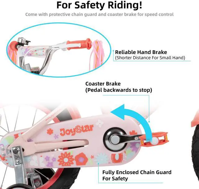Watch your little girl's eyes light up as she discovers the joy of riding with the JOYSTAR Little Violet kids bikefeaturing a safe front caliper and rear coaster brake, adorable basket for treasures, and removable training wheels, all designed to give her the confidence to ride through the neighborhood with endless smiles on her very first adventure.