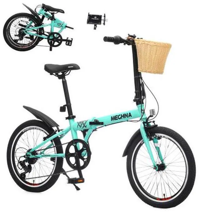 20 Inch Folding Bike for Adults with Basket, Phone Holder & Fenders, Steel Frame 6-Speed City Commuter, Dual V-Brake Portable Compact Bicycle for Men & Women