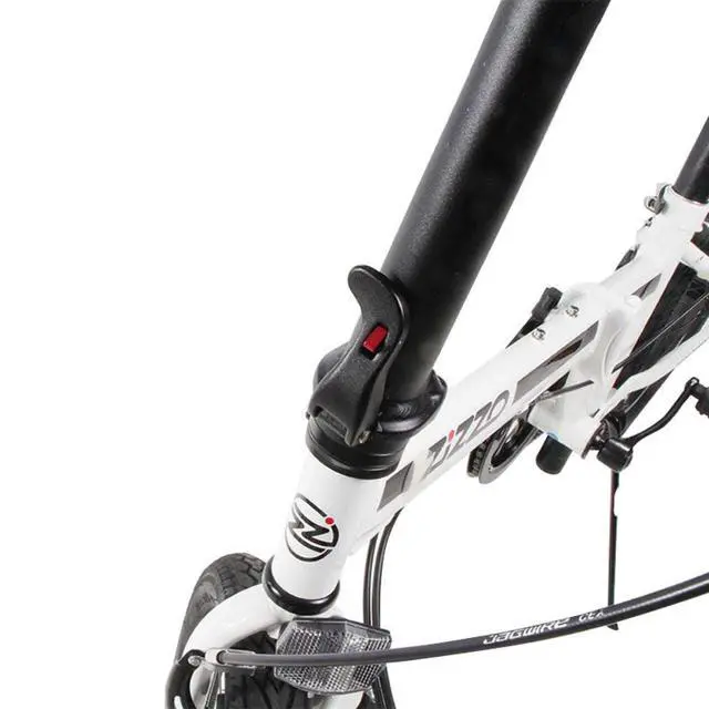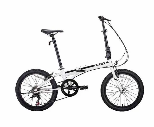 Zizzo Ferro 7-speed 31 lb. High Tensil Steel Folding bicycle. Comes standard with HT Steel Frame, Alloy adjustable-height folding handlebar stem, folding pedals, adjustable alloy seatpost, wide confort saddle- fits heights 4'11" to 6'3", front and rear alloy V-Brakes, grip-shifter, all-terrain tires, wide comfort saddle, 240 lb. capacity. Attachment points available for adding rear rack, water bottle cage and fenders. Non-electric!