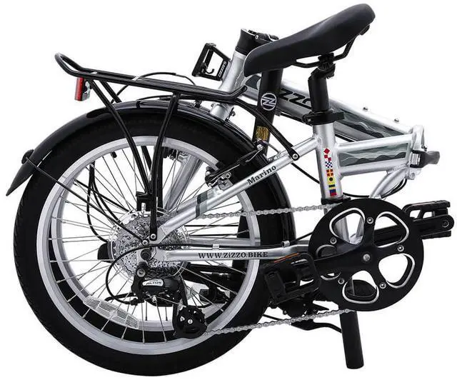 Zizzo Marino 8-speed 24 lb. Aluminum Rust Resistant Folding bicycle. ZiZZO has upgraded most of the components, parts, screws, nuts, and bolts to rust-proof/resistant materials to bring you a bike that features a rust-resistant rating of 99.75 %! Comes standard with Aluminum frame, Alloy adjustable-height folding handlebar stem, folding pedals, adjustable alloy seatpost - fits heights 4'11" to 6'3", magnetic frame catch, front and rear alloy V-Brakes, grip-shifter, all-terrain tires, wide comfort saddle, Pig Nose adapter for front rack, front and rear fenders, Rear Rack, 240 lb.