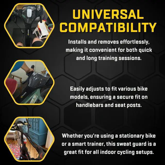 Designed for versatility, this sweat guard fits most indoor bikes and can be adjusted for a custom fit. Its durable construction is both sweat and water-resistant, making it easy to maintain and clean after every ride. Simply attach the guard to your bikes handlebars and seat post, and you're ready to go. When your workout is over, its just as easy to remove.
