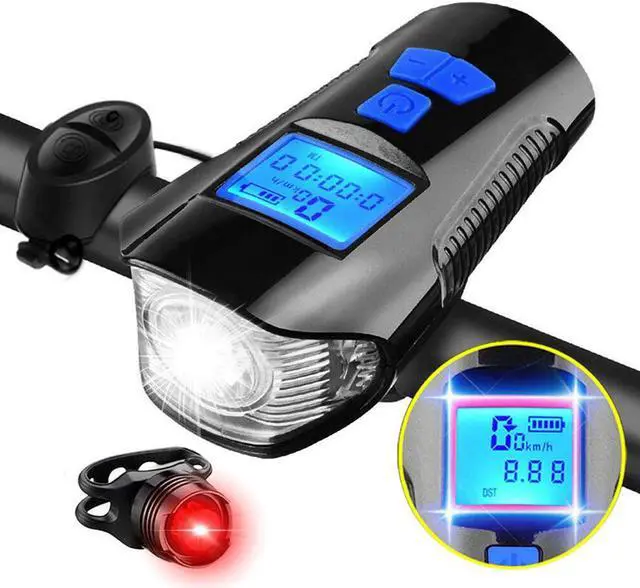 Ultra Bright USB Rechargeable Bike Light with LCD Speedometer Odometer– Headlight & Tail Light Set- Fits All Bicycles, Hybrid, Road, MTB, with Quick Release