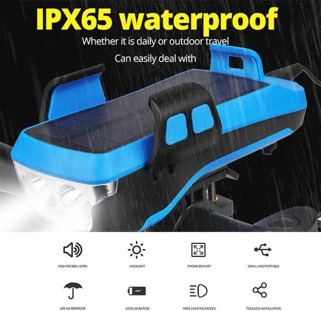 4 IN 1 BIKE LIGHES SET : Solar bicycle front light with horn (3 lighting modes) + Rear light (2 lightning modes) + phone holder + Power bank. Extra brightness to get you noticed in darkness or in traffic. Greater visibility and safety are ensured. The head light horn with loud sound reaches 130dB.
