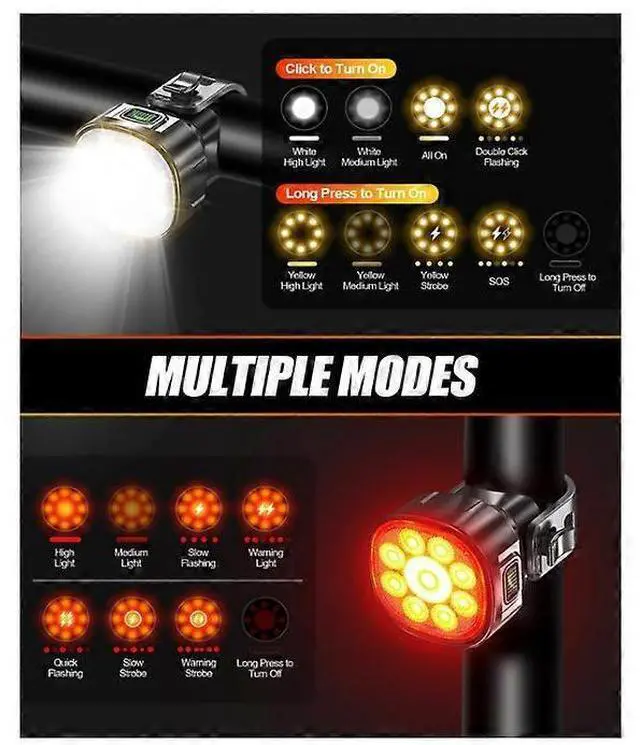 6 Front & 4 Rear Light Modes: Easily switch between high, medium, strobe, and SOS modes to adapt to any environment.