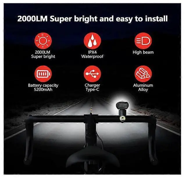 Illuminate your night rides with this high-performance front bike light, featuring 2000 real lumens for superior visibility and safety. Crafted from durable aluminum alloy, it's built to withstand rugged cycling conditions.