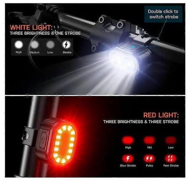 * **Ultra-Bright Illumination**: Front light delivers 200 lumens with 4 modes (high, medium, low, strobe); rear light features 14 LEDs with 6 modes for maximum visibility.