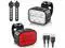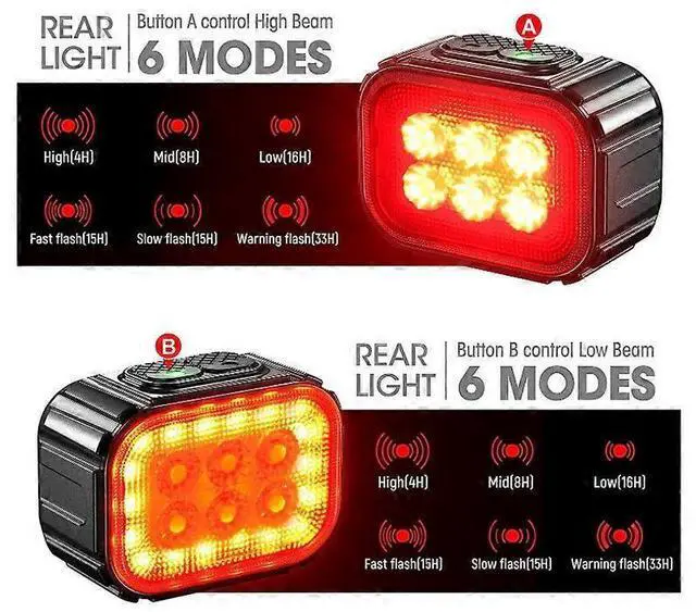 - **USB Rechargeable**: Front light has 1100mAh battery (4-35 hours runtime), rear light 350mAh ( 2.5 / 1.5 hours charge time), with over-charge protection.