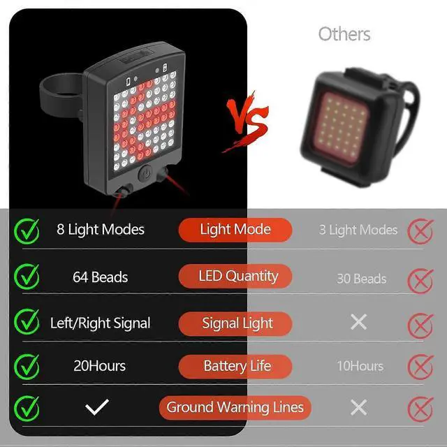 * **Remote Control with 8 Modes: ** Easily switch between 8 lighting modes, including dedicated left/right turn signals, directly from your handlebar for ultimate convenience and safety.