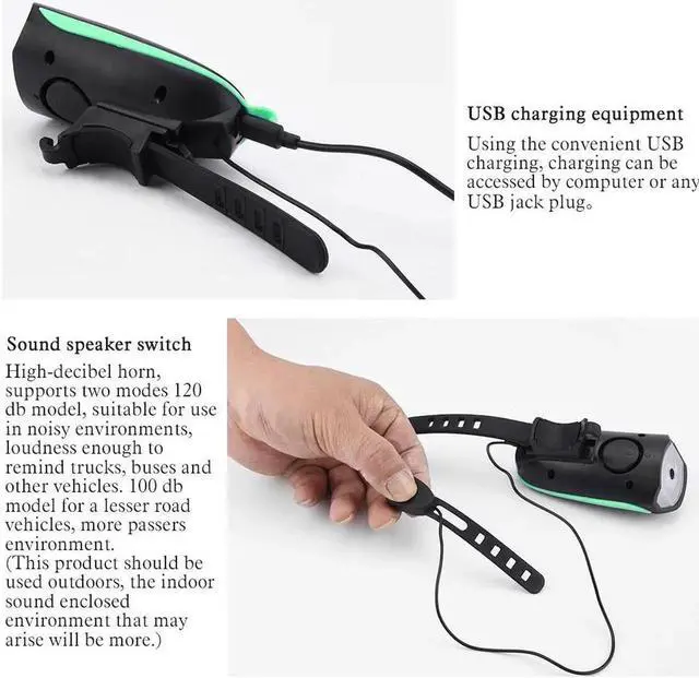 One-stop shopping allows you to remove the tedious selection process. Built-in 1200MAH polymer lithium battery (can be charged more than 500 times) IPX4 level waterproof headlight 3 mode lighting: Hard light mode-Weak light mode-Strobe mode 120 db loud enough to remind the trucking, bus, car and van drivers make riders safer. WIth 120 db horn, 5 sound modes, holding down the button for about 5 seconds to switch. Easy to install and quick release. About Bike LED taillight