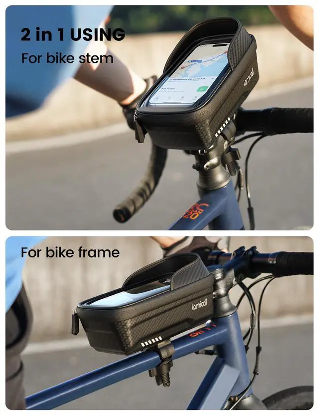 2 in 1 Using - for Top Tube & Stem This bike bag is designed with a 2 in 1 using feature, making it fits perfectly on the top tube or stem of your bike; A compact and innovative bike phone holder and bag, making your biking experience even better; The Product Dimensions is 8.2"L x 4.3"W x 4.7"H