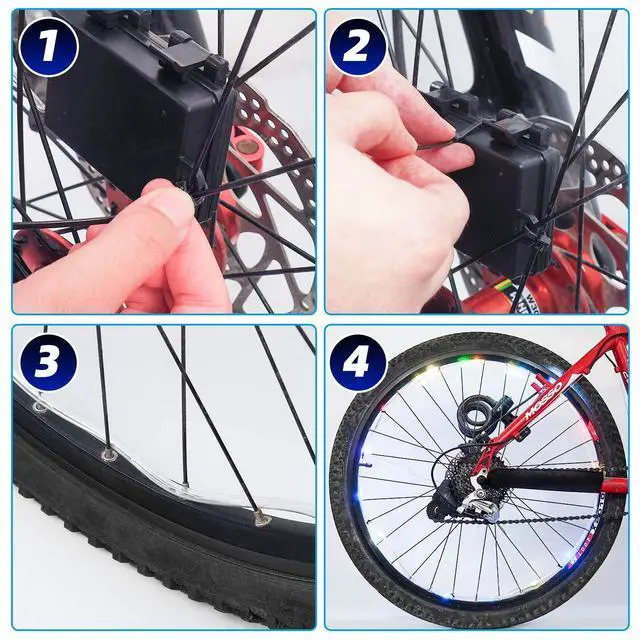 Install 3pcs AA battery(Batteries not included) in the battery-case. Position the battery-case inside the wheel spokes, its back lean on the spoken. Choose an X point where there are 2 spokes cross. Take one tie passed through the hole of the battery-case tightened to the X point.