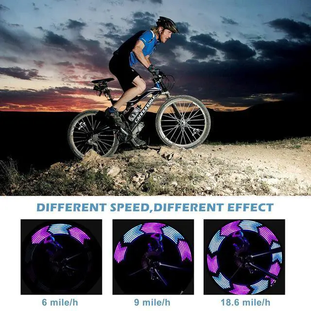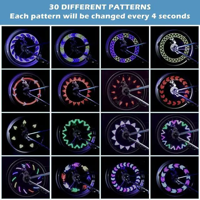[30 PATTERNS BIKE SPOKE LIGHTS] Enjoy 30 different patterns that change every 4 seconds. The patterns become complete when riding at a speed of 13 miles/hour. Thanks to the double-side lamp design, the light can be seen from all directions, enhancing safety during night rides.