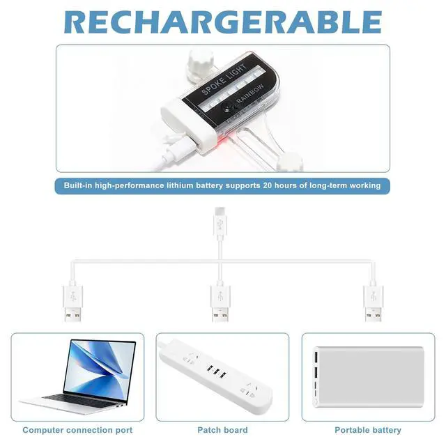 [RECHAREABLE BATTERY & REUSEABLE] Our bike wheel light features a built-in rechargeable 220mAh lithium battery, providing over 22 hours of continuous use. It is suitable for 16 inches and larger spoke wheels, making it versatile and reusable.