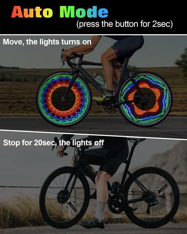 Speed-Sensitive Dynamic Display: When riding at 13 miles/hour or faster, the patterns transform into dazzling designs, adding a cool and eye-catching effect to your bike wheels. With a simple long-press of the power button, activate the automatic mode the lights turn on when you're in motion and automatically switch off after 20 seconds of inactivity, conserving battery life for prolonged usage