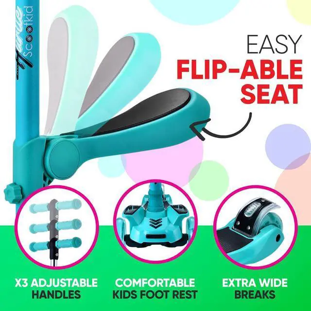 The Hurtle ScootKid 3-Wheel Kids Scooter (HURFS86TB) is a fun and safe scooter designed for children and toddlers. Featuring a 3-wheel trike style and a comfortable fold-out seat, this scooter provides maximum stability and comfort while your child learns to ride.