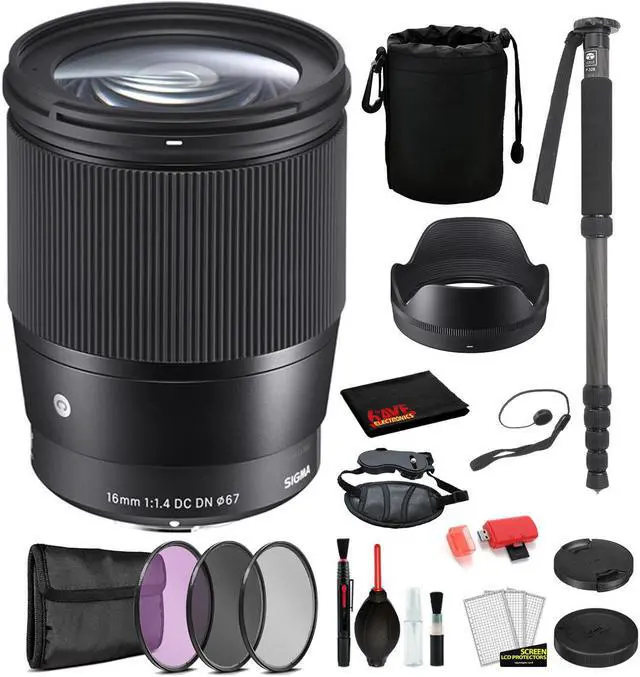 Sigma 16mm f/1.4 DC DN Contemporary Lens for Sony E Mount with: Pro Series Monopod, 3PC Filter Kit + More