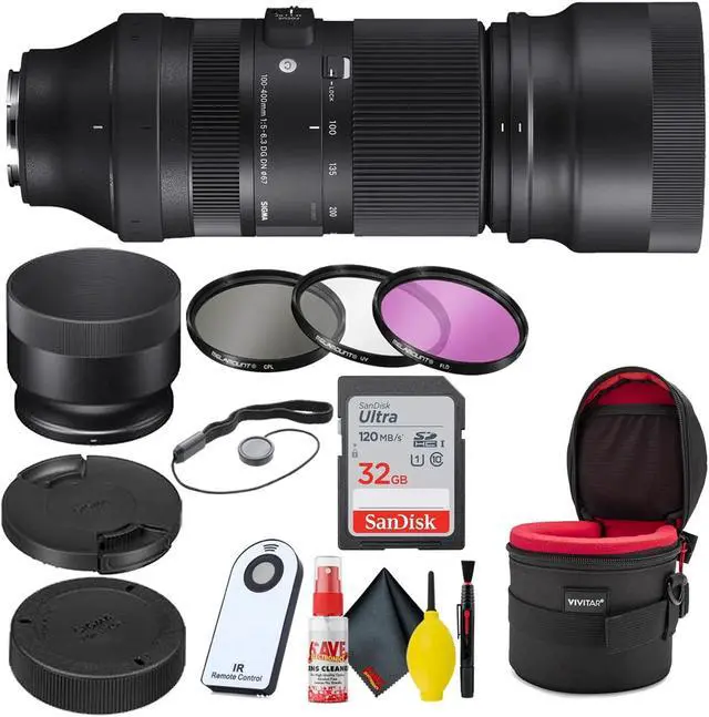 • Bundle Items Include: 1 x Sigma 100-400mm f/5-6.3 DG DN OS Contemporary Lens for Sony E + 1 x 32GB SD Card + 1 x 3 Piece Filter Kit + 1 x Lens Cap + 1 x Lens Case + 1 x Wireless Remote Shutter + 1 x Cleaning Kit. As part of the Contemporary line within Sigma's Global Vision series, this lens is designed to achieve a balance between convenience and performance, and meshes a compact, lightweight build and versatile handling with notable optical attributes.. Telephoto zoom is designed for full-frame Sony E-mount mirrorless cameras, but can also work with APS-C models where it provides a 150-600mm equivalent focal length range.. Integrated AFL button can be programmed to adjust various shooting settings and the lens also features a focus limiter switch for faster focusing performance within certain distance ranges. There is a zoom lock switch to prevent the barrel from accidentally extended.. KEY FEATURES: E-Mount Lens/Full-Frame Format